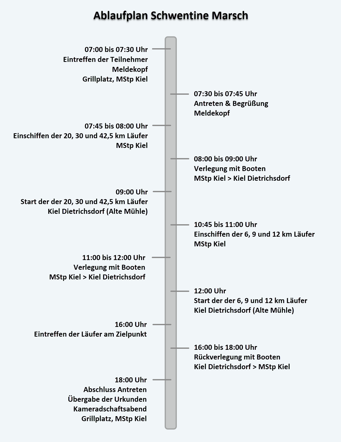 Die Verlegung der Marschgruppen vom MStp zum Start, erfolgt mit mit einem V-Boot (ggf. Marinekutter) der RK Marine Kiel.