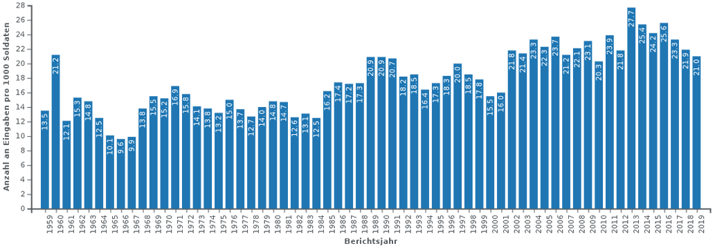 Die folgende Grafik zeigt die Anzahl der Eingaben an den Wehrbeauftragen bis 2019, bezogen auf 1000 Soldaten. Der niedrigste Wert mit 9,6 Eingaben war im Berichtsjahr 1966, der höchste Wert wurde mit 27,7 Eingaben im Berichtsjahr 2013 erreicht.