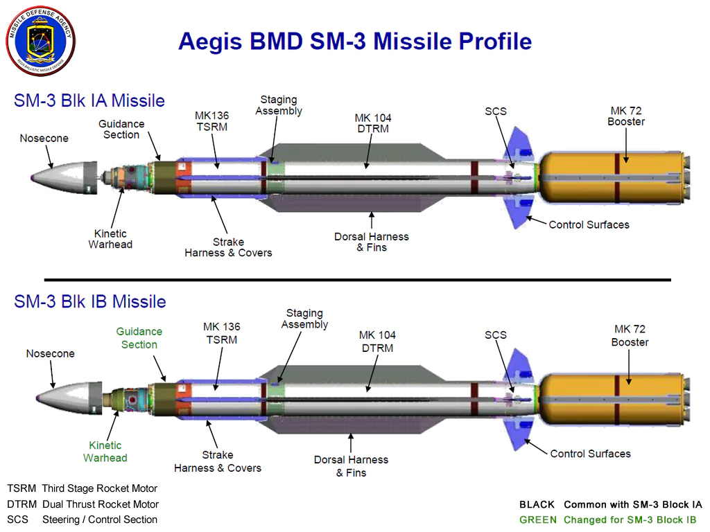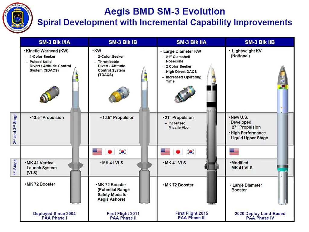 Ab 2014 wurde die SM-3 Block IB eingeführt, die über eine verbesserte Avionik, Störfestigkeit, Manövrierbarkeit und einen größeren kinetischen Gefechtskopf verfügt und 2019 die verbessert SM-3 Block IIA vorgestellt.